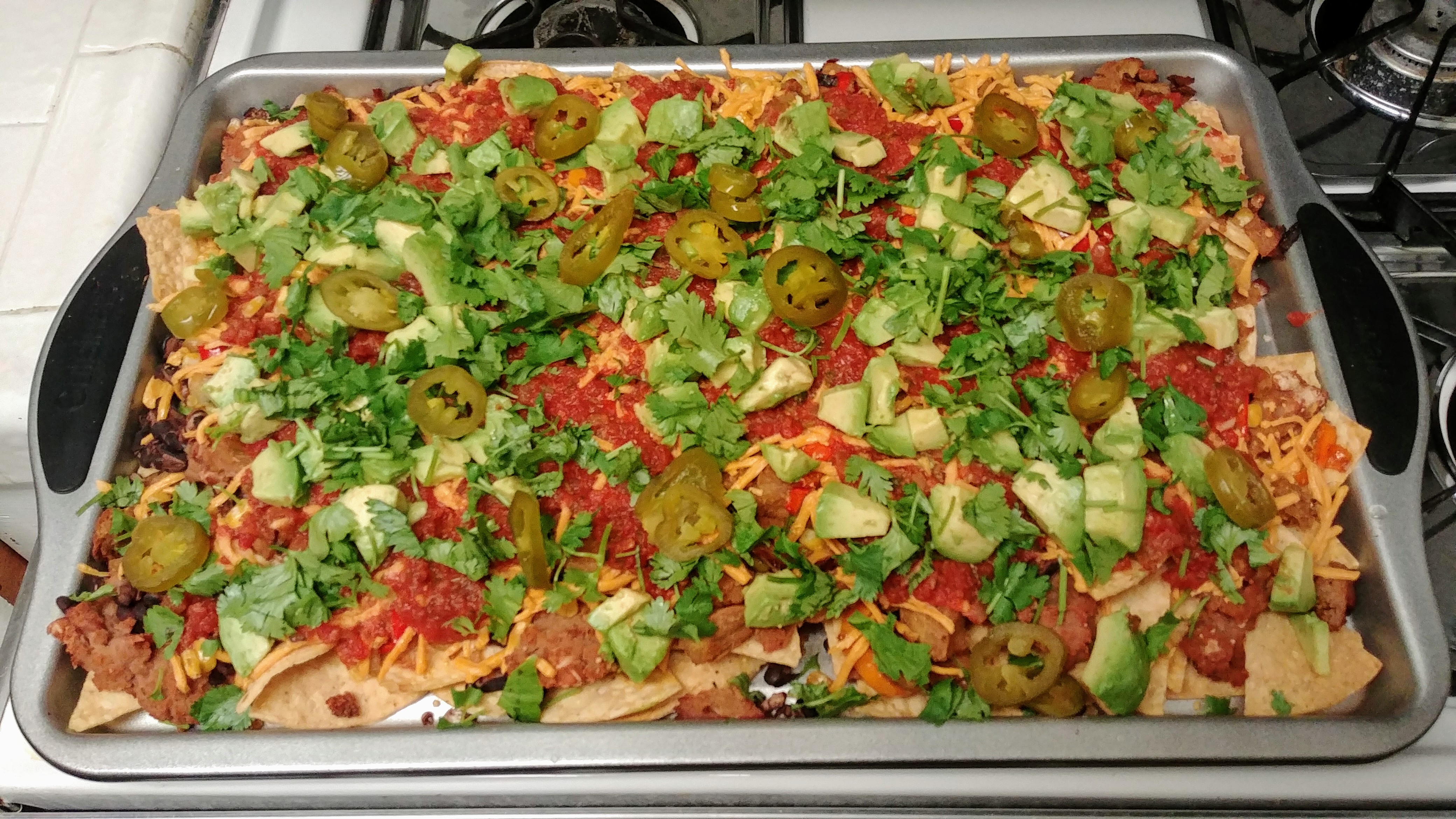 - Remove from the oven and top with salsa, avocado, cilantro and jalapeño. Could also add vegan sour cream and green onions. Try not to eat the whole pan!