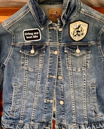 Women’s size medium. Re-purposed jean jackets in excellent condition each uniquely designed with sewn on vegan messaged patches. Can be personalized with custom patches at request. Each jacket is one-of-a-kind.